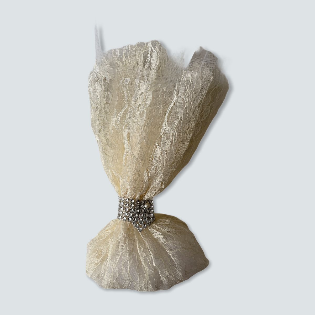 Wedding favor lace with inner tulle tying ribbon with rhinestones and pearl, inner filling with tulle 5 almond candies.